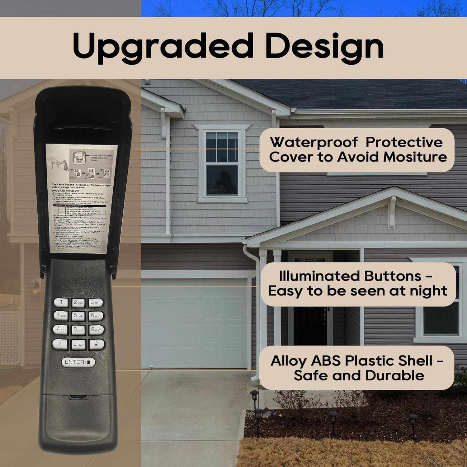 - 【Convenient Design】The garage door keypad is completely wireless, which is powered by battery (included); Clamshell design and waterproof material extend the service life; the backlit numeric button allows for quick and convenient code input in the dark.