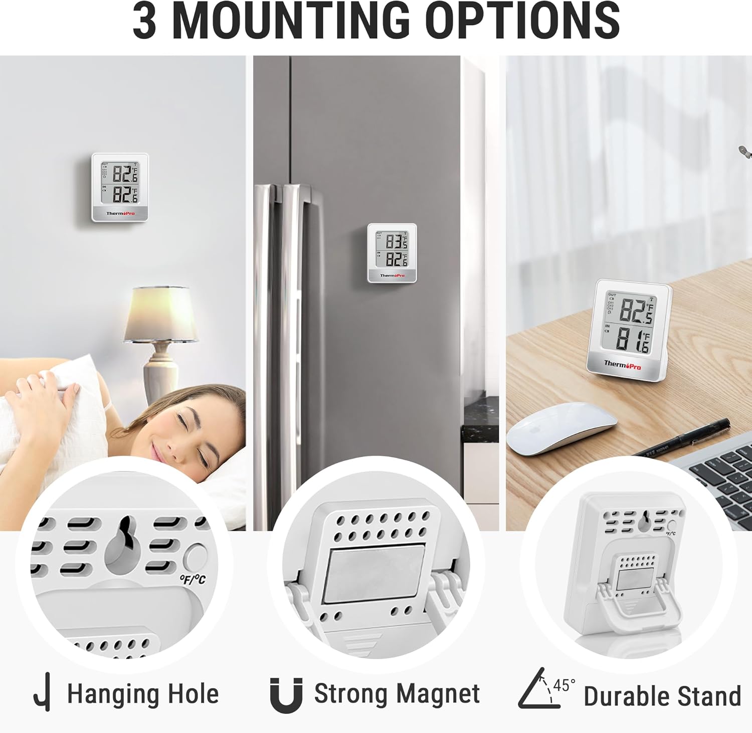 - Multiple Placement Options: Inside outside thermometer wireless features 3 placement options to allow you place it anywhere: Durable stand for tabletop, strong magnet for metal surface, hanging mount for hook