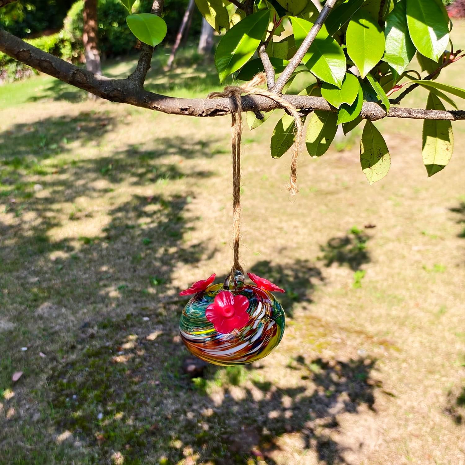 Small Glass Hummingbird Feeders for Outdoors Hanging - Hand Blown Glass Ball Nectar Feeding, Multi Color with 3 Flowers Feeding Ports, Decor for Garden/Backyard Outside