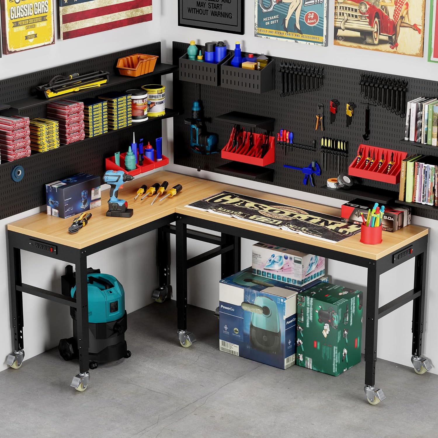 - Universal Wheels: The workbench comes with smooth wheels with wheel locks that make it easy to move the workshop bench in all 360°directions, put the table where you want it without a lot of effort and without scratching floors