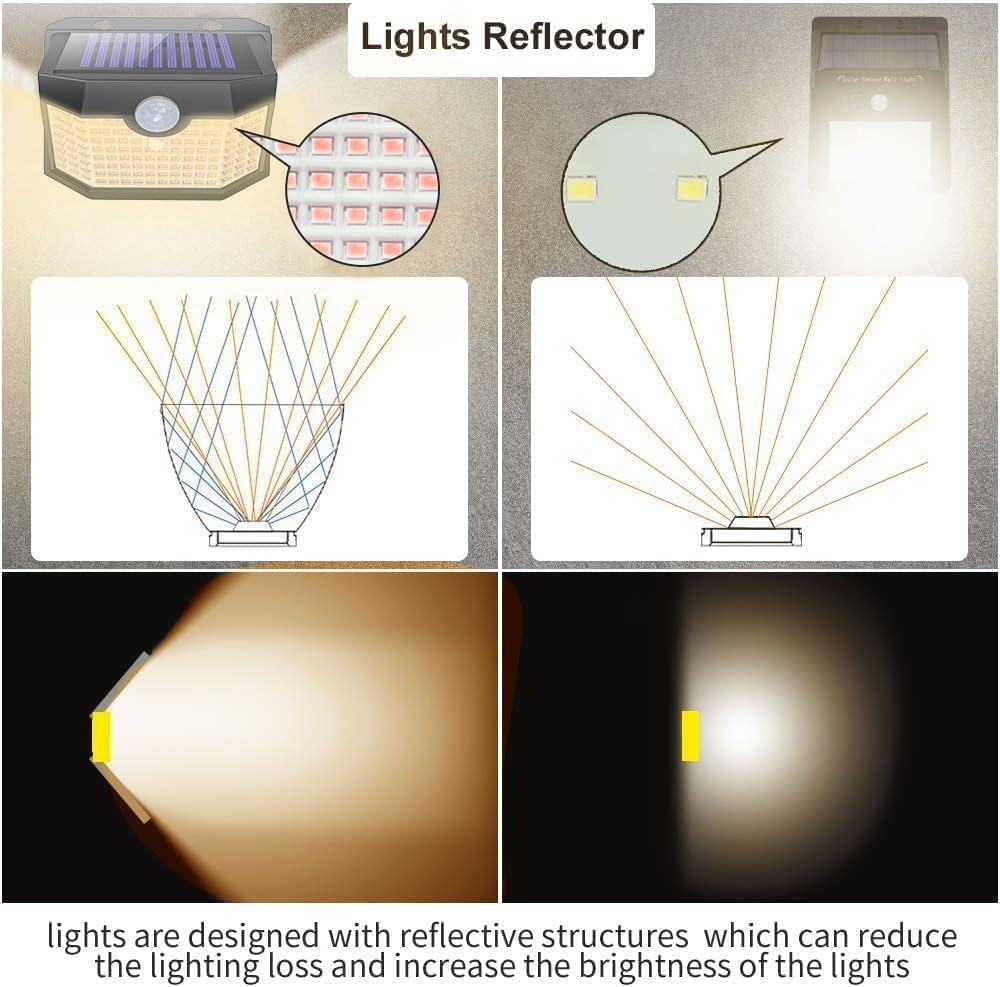HMCITY 120 LED Outdoor Solar Lights- with Motion Sensor and 3 Lighting Modes, IP65 Waterproof Wide Solar Wall Lights Ideal for Garden Patio Yard (Front Button 4Packs, Warm White)