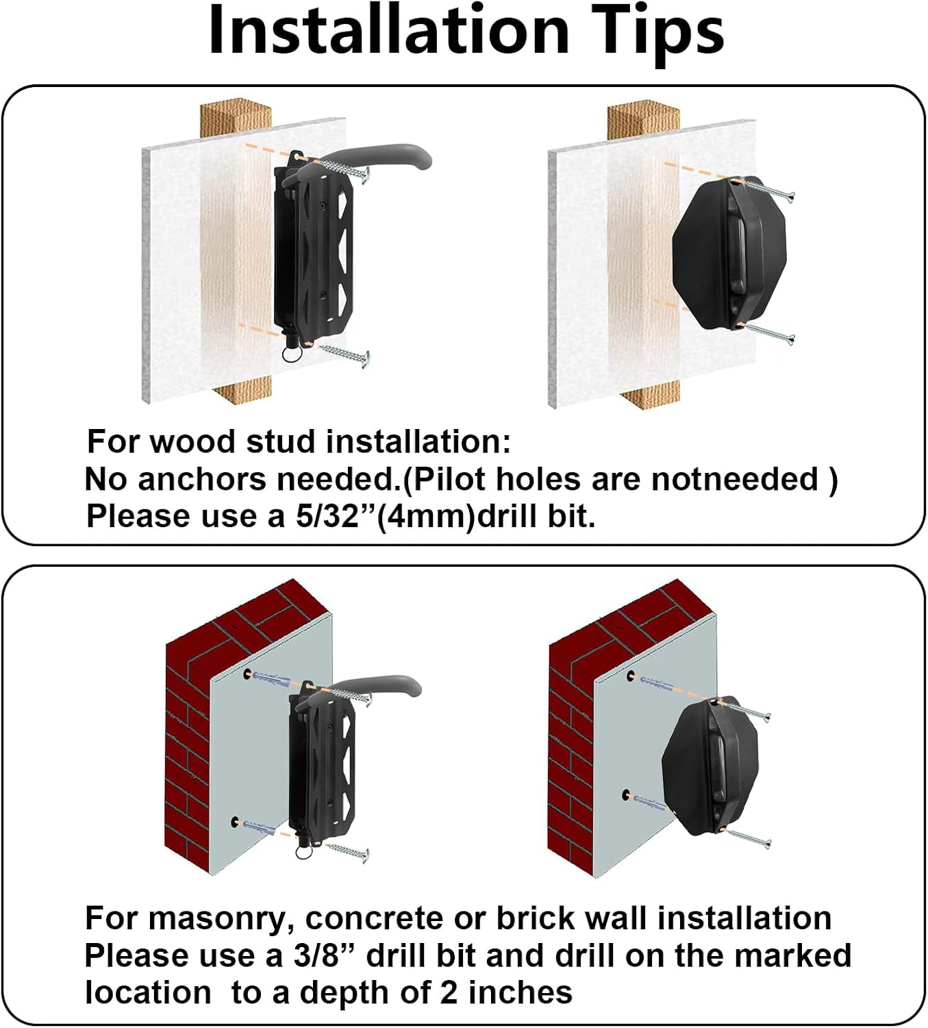 - 【Installation Tips】For wood stud installation:No anchors needed,(Pilot holes are notneeded )Please use a 5/32”(4mm)drill bit. For masonry,concrete or brick wall installation Please use a 3/8”drill bit and drill on the marked location to a depth of 2 inches.