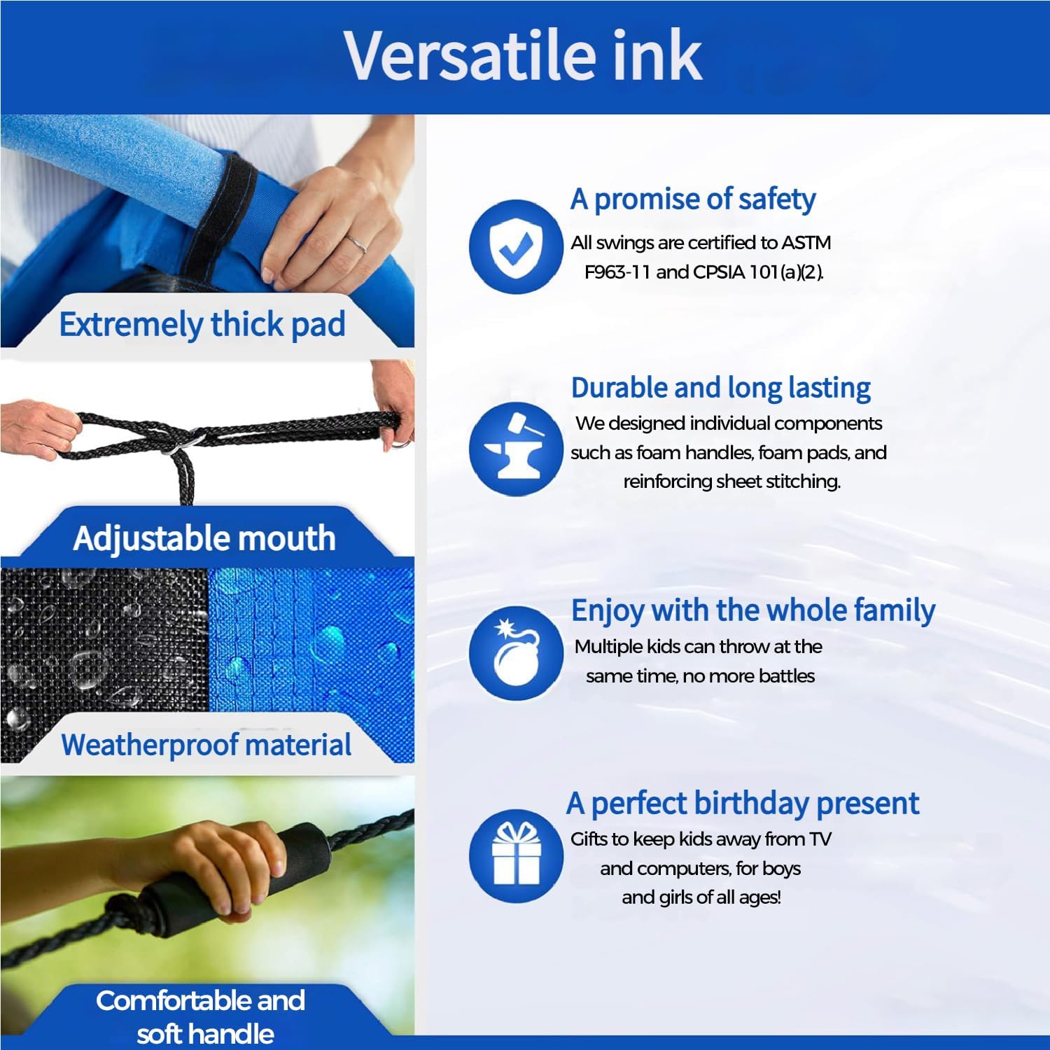 - Effortless Assembly For Family Fun: With the included hanging kit and adjustable ropes, you can set up this outdoor swing for kids in minutes on a swing set, tree, pergola, or playground, enhancing your family's outdoor experiences