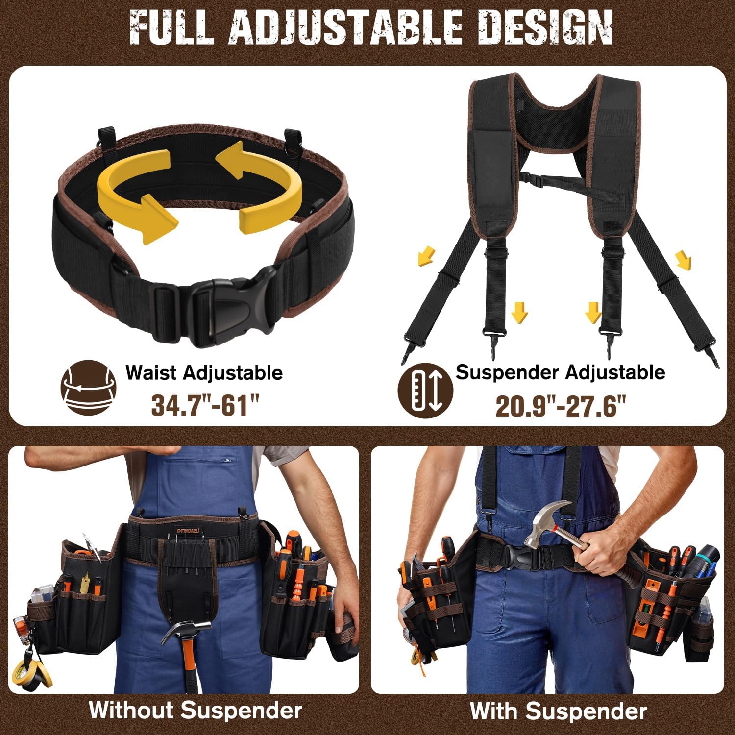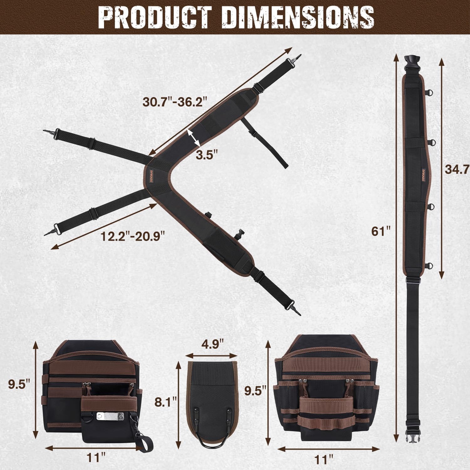 - Ergonomic Shoulder Support: The adjustable and detachable suspender of this carpenter tool belt features 3.5" wide padded straps and a 4-point weight distribution system that balances loads evenly across your shoulders and back, rather than just your waist. This reduces strain during long workdays