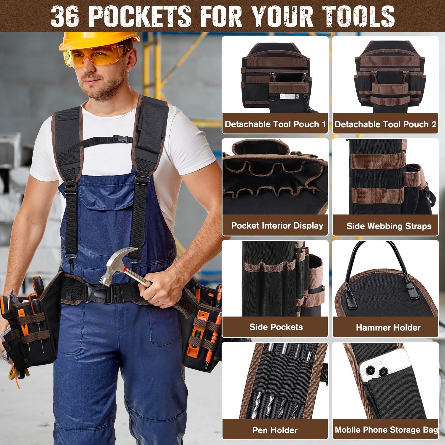 Tool Belts for Men, 36 Pockets Tool Belt with Suspenders, Heavy Duty Tool Belt Suspenders with Detachable & Adjustable Tool Pouches Bag for Electrician, Carpenter, Construction, Framers(35"-61")