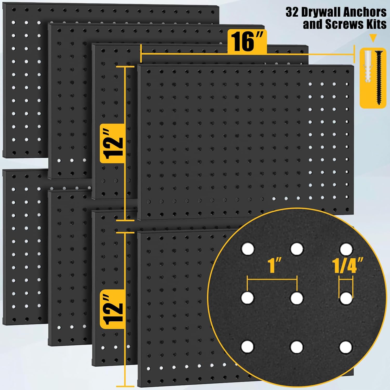 8 Pcs Metal Pegboard Panels, Heavy Duty Peg Boards for Garage and Garden Tool Storage, Includes Drywall Anchors and Screws Kits, Black (8 pcs 16in x 12in)