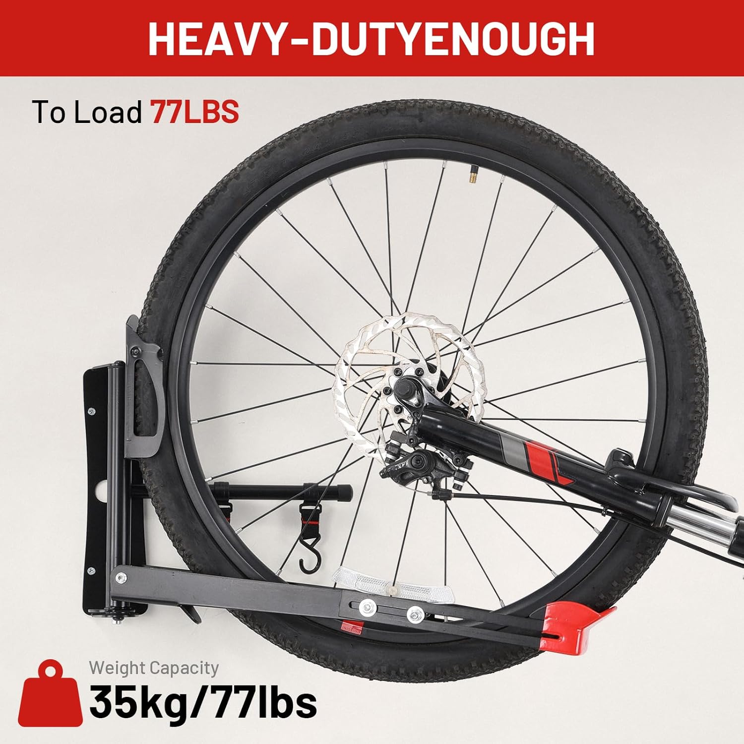 - 【Durable & Secure Construction】Bike wall hanger made of sturdy carbon steel material, our wall bike rack can support up to 77 lbs. The rubber-coated front wheel holder prevents wheel scratches, and the rear tire tray enhances bike stability and prevents wall scratches.