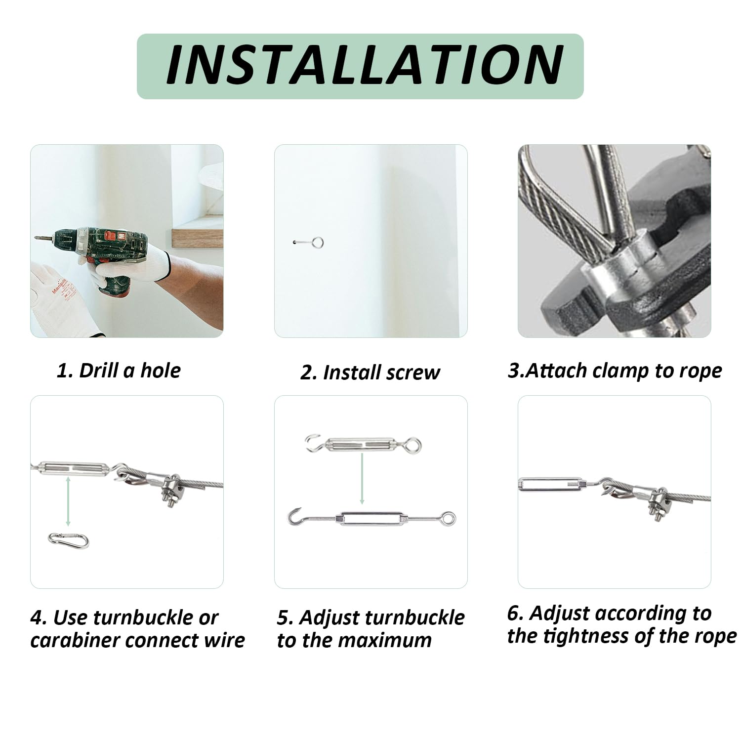 - Widely Useful:Suitable for shade sail hardware,outdoor tent rope,outdoor light rope, cable fence, garden plant traction rope,decorative rope,clothesline, garden fence,deck cable railing,yard decorative light line, hanging pictures and etc
