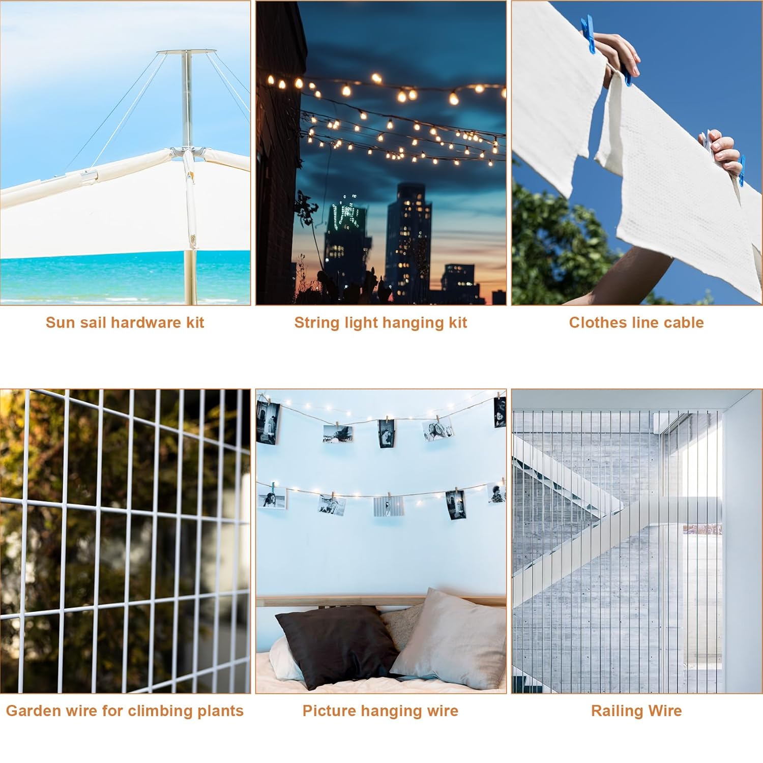 - Wide Application: The clothes line cable kit is perfectly suitable for tent fixing, garden plant pulling, garden light string hanging, fence reinforcement, painting hanging, and other needs. A string light wire hanging kit can also be used for deck railings, awnings, and romantic party decorations