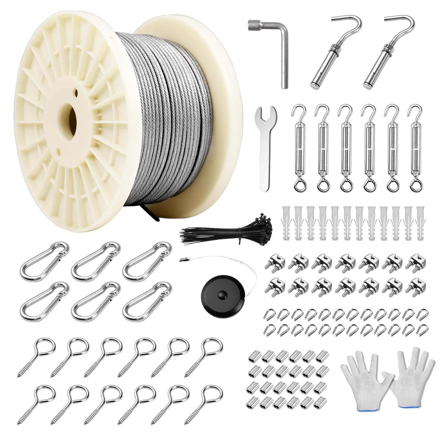 - Wire Kit with Gloves: The 1/8 wire rope kit is equipped with labor protection gloves to protect your hands when using it. The wire trellis kit is complete with accessories, including professional installation tools (socket wrench/cable cutter)