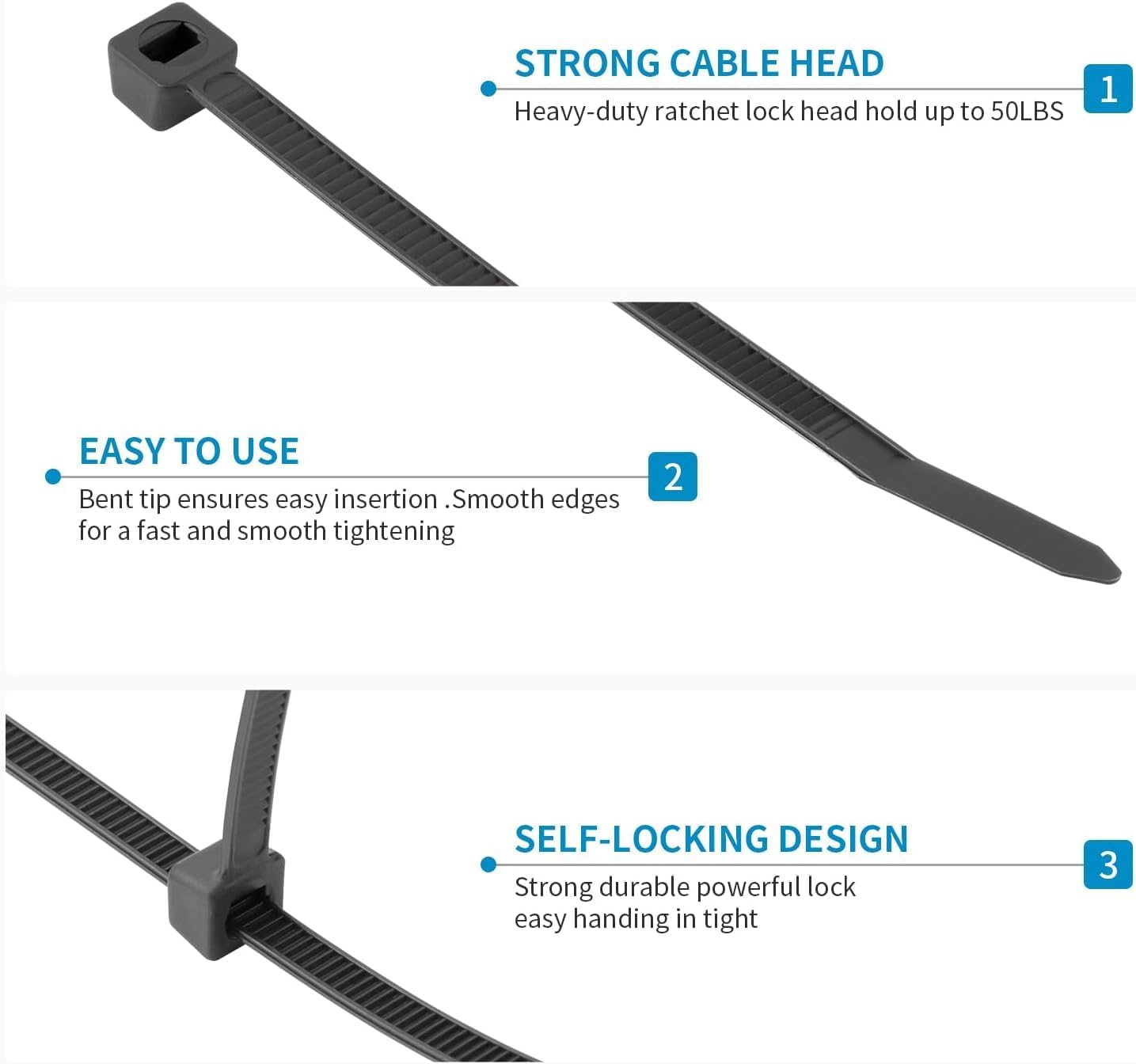 - ★【Great Design】Self-locking fastener design, sturdy and durable, easy to operate. The width of our cable tie is 0.18inch/4.8mm, which makes the cable tie stronger than the same size cable tie on the market and tensile strength could handles most purpose of binding in life.