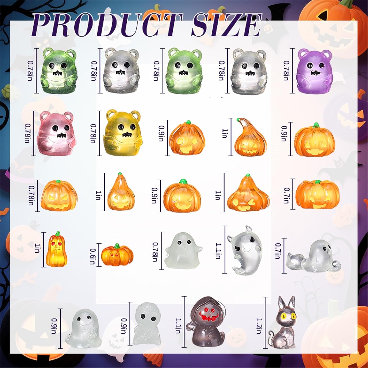 - Mini Size: adorn your Halloween setups with these miniatures, sized between 0.79-1.57 inches/ 2-4 cm, ideal for embellishing fairy houses, cakes, or any spooky corner, injecting vibrancy into your festivities