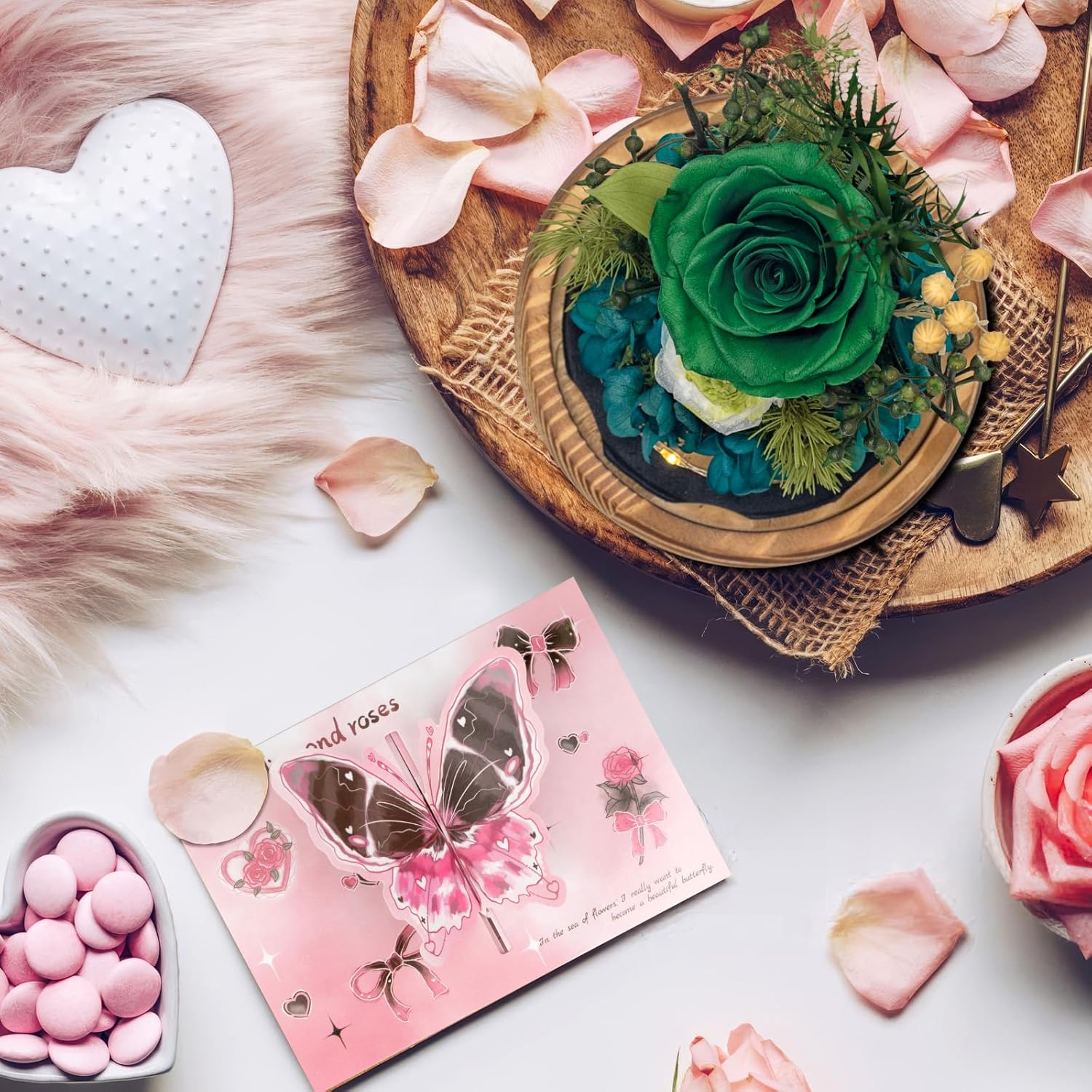 - ๐๐ง๐ข๐ช๐ฎ๐ ๐๐ซ๐๐๐ง & ๐๐ก๐ข๐ญ๐ ๐๐จ๐ฌ๐ ๐๐จ๐ฎ๐ช๐ฎ๐๐ญ: A striking emerald green rose paired with an ivory bloom creates a fresh, modern look that stands out from ordinary bouquets. Green represents renewal and prosperity, while white symbolizes purityโmaking this preserved flower dome an uplifting choice for birthdays, anniversaries, or housewarmings