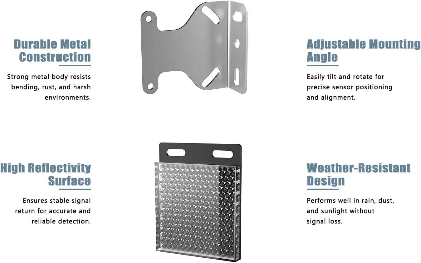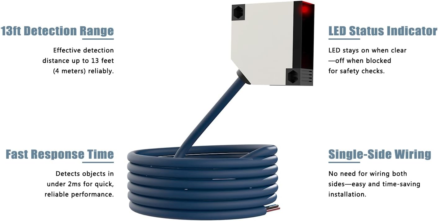 - 🛡️ Precision Safety with Photoelectric Beam Sensor — Wall-mounted retroreflective sensor detects objects up to 13ft away, stopping or reversing the gate instantly on obstruction. Designed for both indoor and outdoor use, with IP65 waterproof rating.